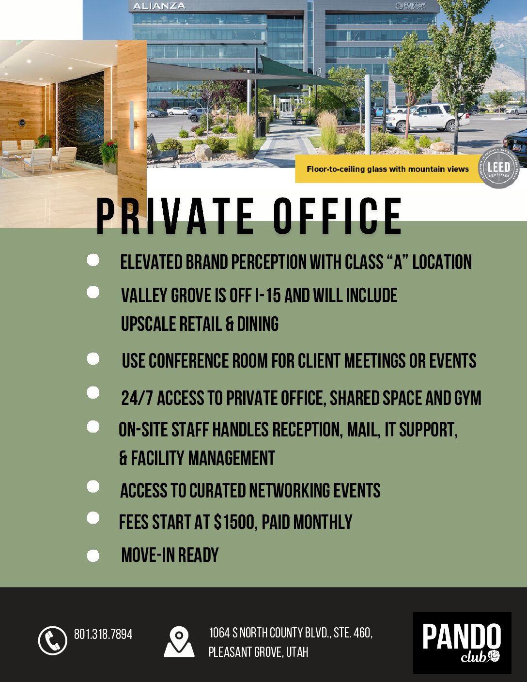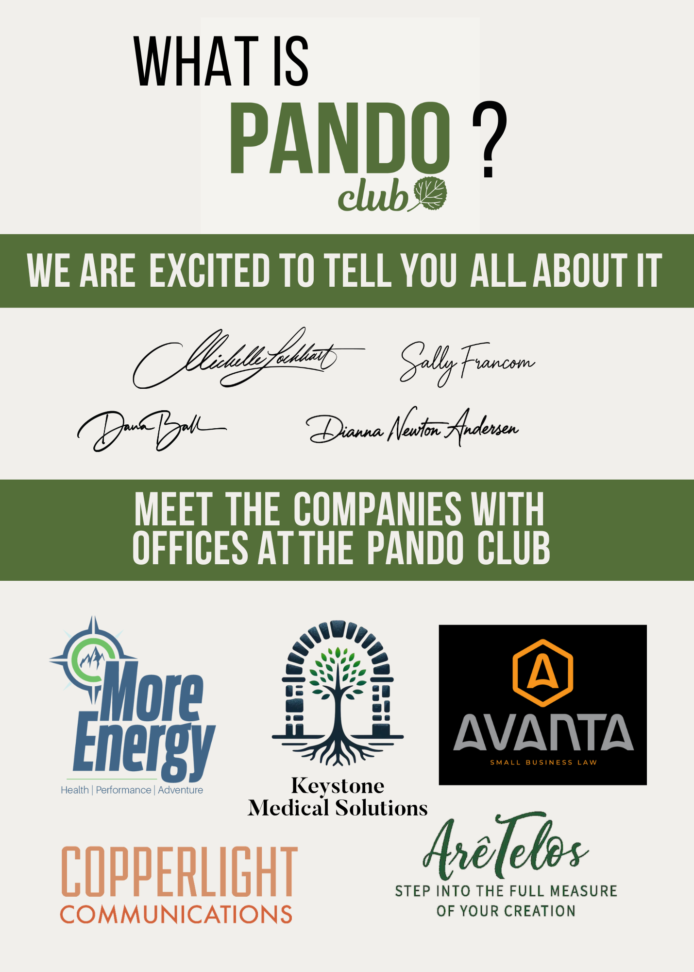 Currently several Pando Club offices are occupied by Utah County-based businesses, including Keystone Medical Solutions, Avanta Business Law, and More Energy Health and Fitness.